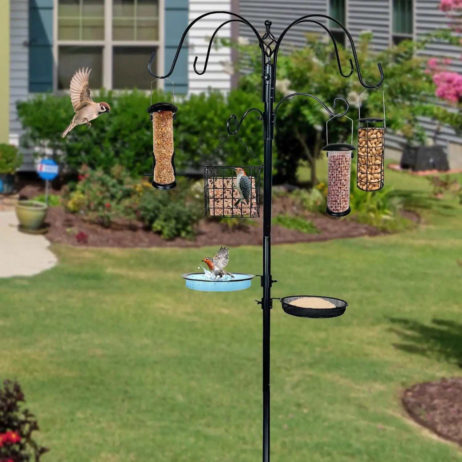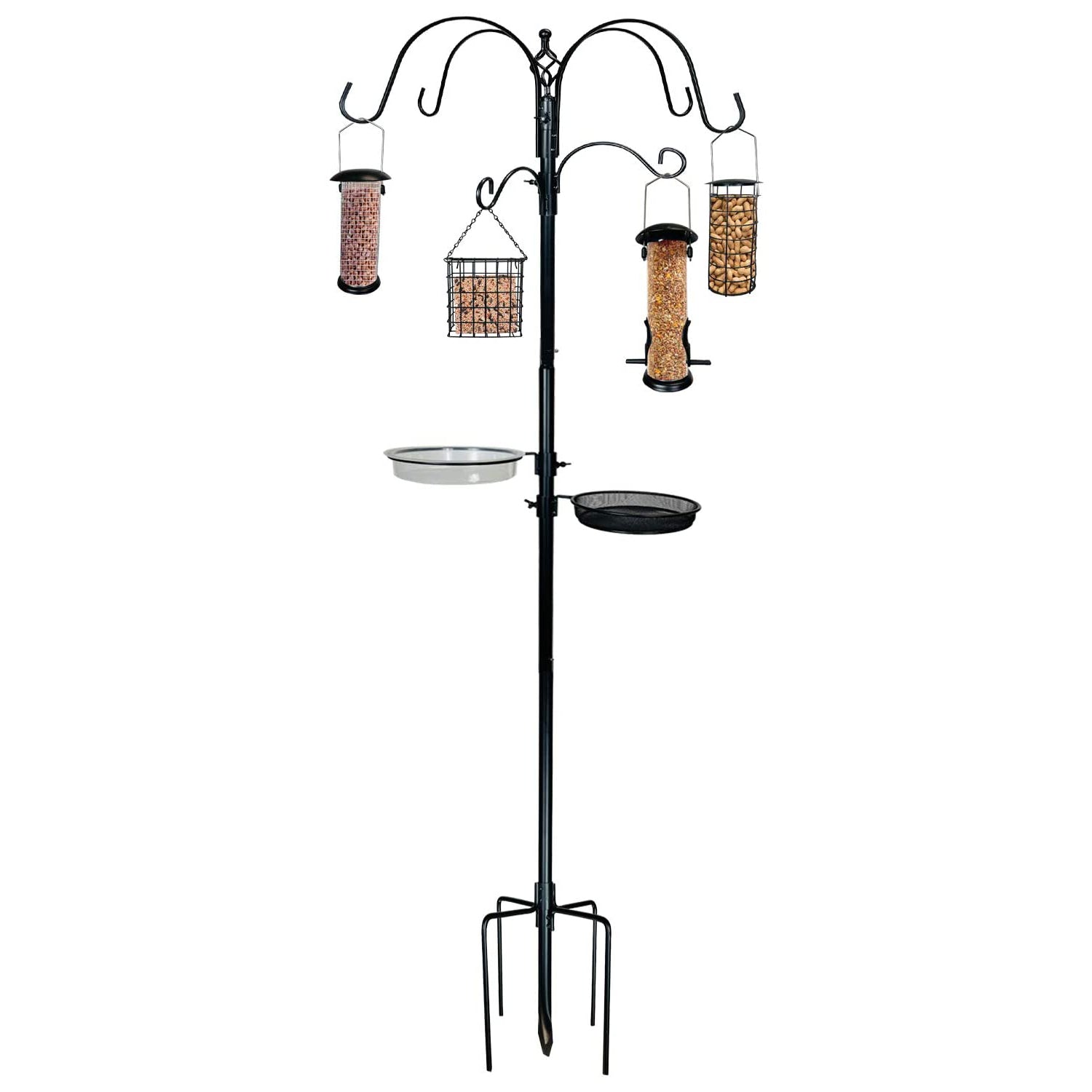 - PREMIUM DESIGN: Rust-resistant, sturdy steel pole stands 91 inches tall and 22 inches wide. Easily adjust the bird feeding bowl or mesh tray to any desired position by loosening and tightening wing nuts by hand. No tools are required! 5 Prong Base adds stability and allows easy arrangement. Just attach the pole stabilizer then step down to the plant. Mesh tray and water bowl detach for easy cleaning. *BIRD FEEDERS INCLUDED*