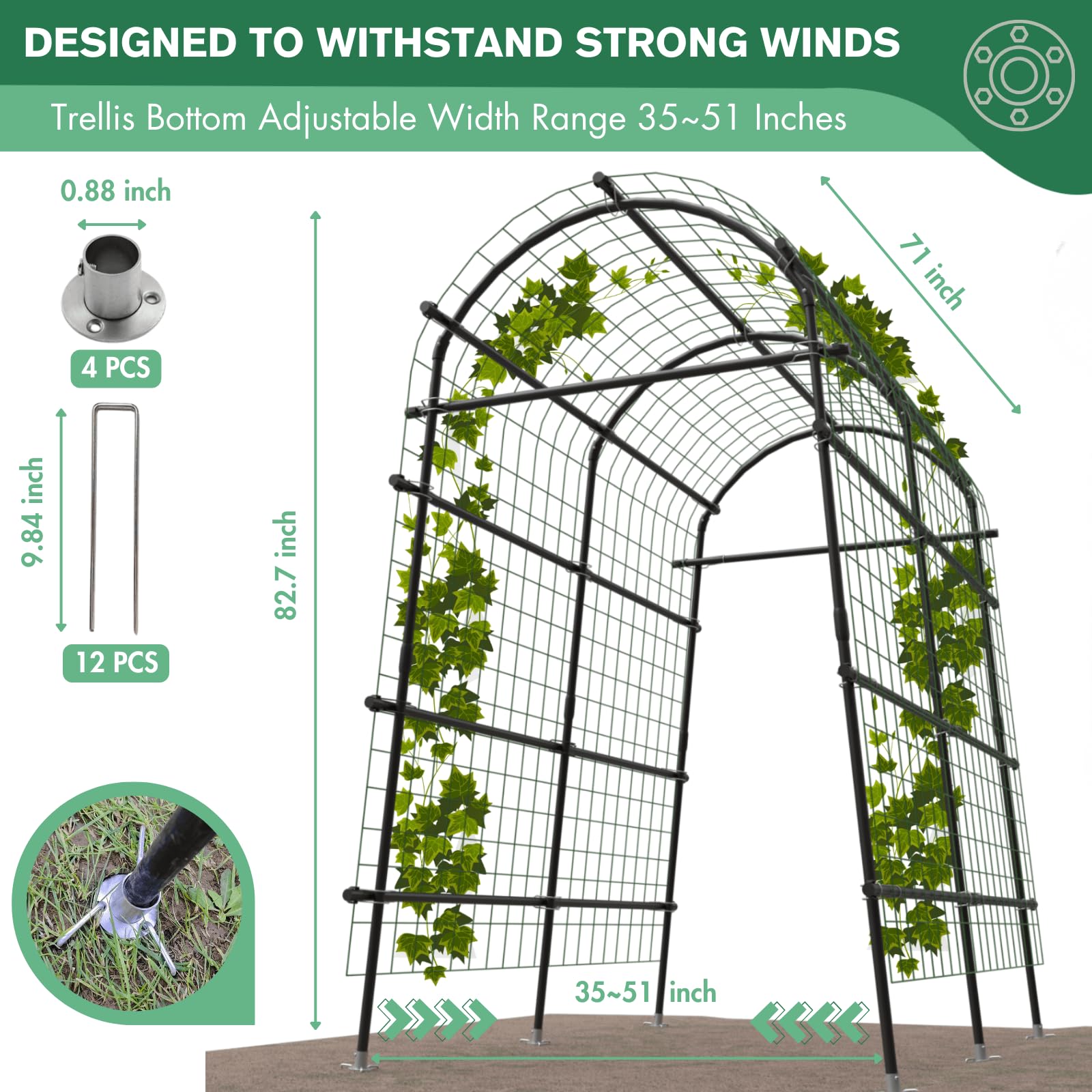 - 【Extra Tall Plant Climbing Support】The Montresor plant vine support trellis measures 70" L x 83" H, with an adjustable width between 35" and 51.2". This sturdy plant trellis can support up to 75 lbs, making it easy to access your berries or vegetables under the arches. We include flange bases and ground stakes to reinforce the trellis legs, enhancing stability. Designed to withstand strong winds and harsh weather, this gardening climbing frame offers reliable protection for your plants.